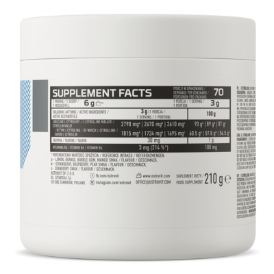 100 % Citrulín patrí medzi neesenciálne aminokyseliny, ktoré slúžia ako prekurzor arginínu na podporu produkcie oxidu dusnatého. Ten môže pomôcť s rozťahovaním ciev, čo by mohlo mať vplyv na lepšie prekrvenie svalov. To v konečnom dôsledku dokáže zaistiť efektívnejšie zásobenie pracujúcich svalov kyslíkom a ďalšími potrebnými živinami. Jeho zloženie je navyše obohatené o taurín a vitamín B6.