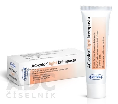 Krycia farebne tónovaná AC-color® light krémpasta je určená na každodenné ošetrovanie aknóznej a citlivej pleti so sklonom k začervenaniu a vyrážkam. Rovnomerne a efektívne prekrýva nedokonalosti pleti, jemne vysušuje a nezaťažuje pokožku. AC-color® light krémpasta obsahuje klotrimazol, ktorý pôsobí proti množeniu baktérií a kvasiniek. Masťový základ umožňuje dlhodobé pôsobenie prípravku. AC-color® light krémpasta je tónovaná železitými pigmentami a spĺňa vysoké kozmetické nároky.