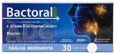 Výživový doplnok Bactoral NEO s vitamínom D obsahuje stabilizovanú kultúru Streptococcus salivarius K12 (2×109 CFU/1 tbl.). ktorá tvorí BLIS peptidysalivaricín A2 a salivaricín B, tzv. bakteriocíny. Táto baktéria dokáže zaujať strategické pozície v dutine ústnej, nosohltane a stredného ucha a dokáže vytesniť nežiaduce druhy. Štúdie dokazujú, že Bactoral NEO je schopný kolonizovať hornú časť respiračného traktu už 3 dni po prvom podaní a je možné ho detekovať ešte 32 dní po ukončení užívania. Vitamín D prispieva k správnej funkcii imunitného systému.