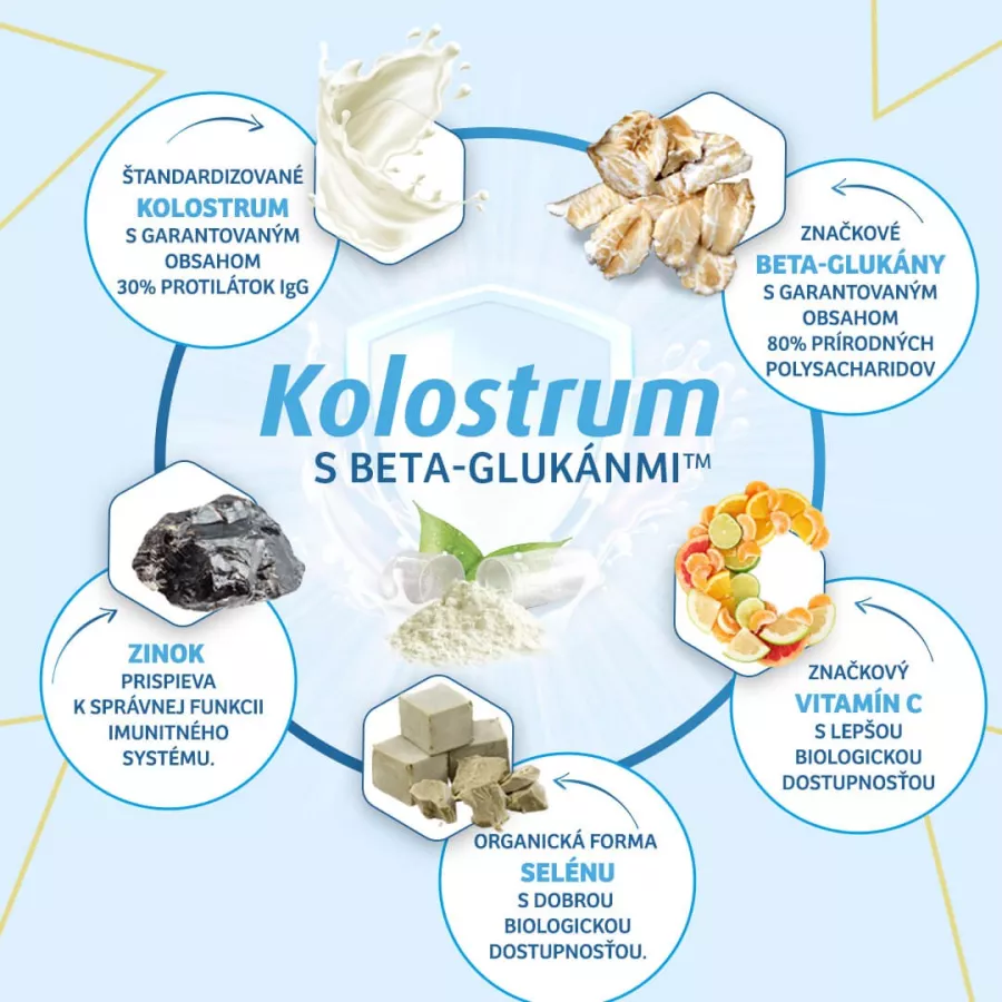Kolostrum s beta-glukánmi, selénom, zinkom a značkových vitamínom C pre podporu správnej funkcie imunitného systému.