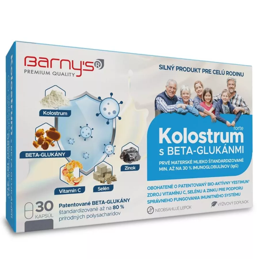 Barny’s® Kolostrum s beta-glukánmi Forte je kombinovaný výživový doplnok, ktorý obsahuje kvalitné bovinné kolostrum vysokej akosti, patentované bioaktívne Yestimun® beta-glukány štandardizované na 80% prírodných polysacharidov, značkovú formu vitamínu C (Nutra-C™) a minerálne látky selén a zinok, ktoré prispievajú k správnemu fungovaniu imunitného systému (EFSA: ID 134, 278, 291, 1757).