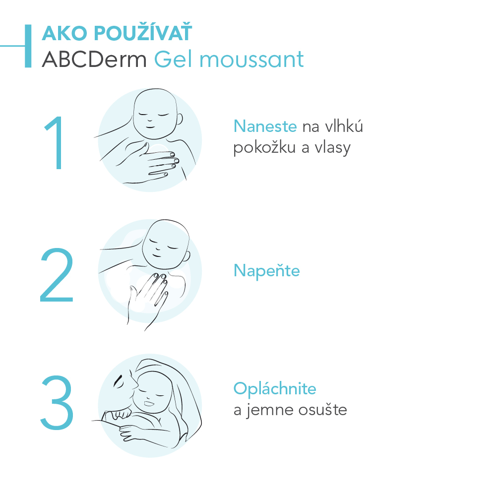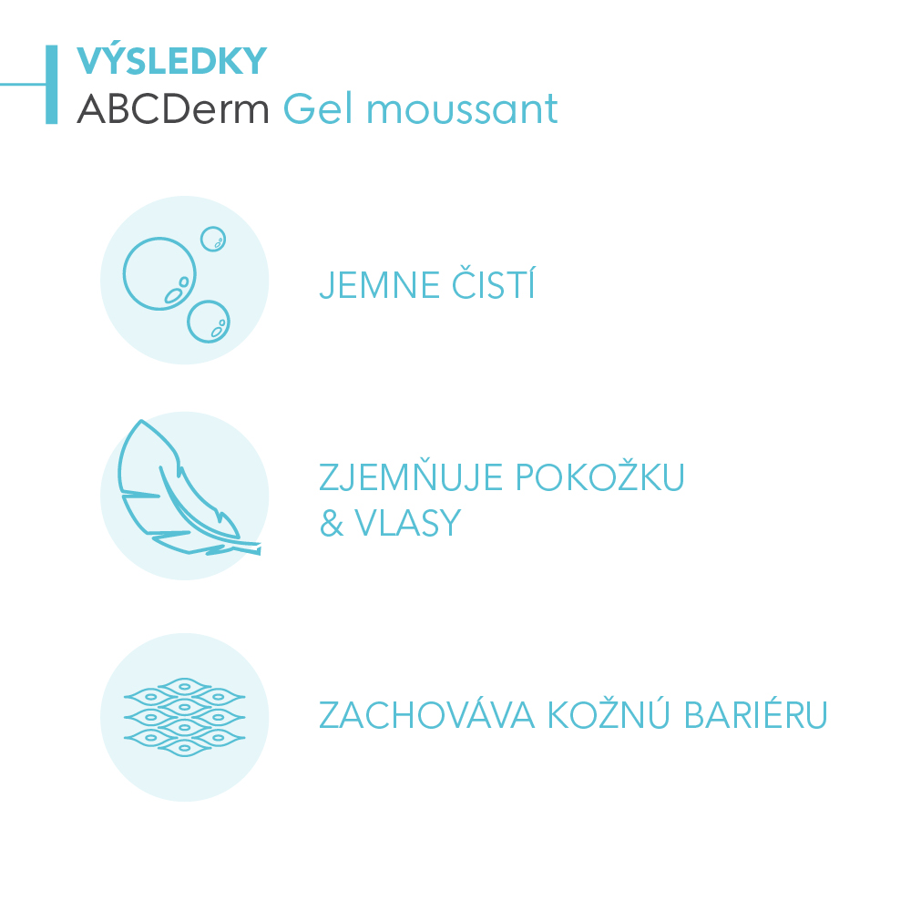 ABCDerm Gel Moussant je vyvinutý v súlade s dermatologickými záväzkami ABCDerm tak, aby rešpektoval jemnú pokožku najmenších i starších detí.