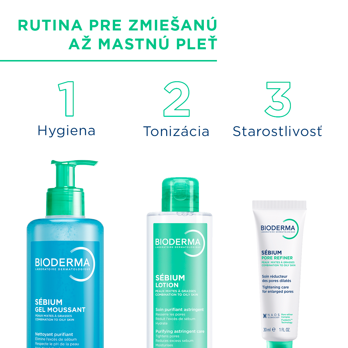 Sébium Lotion hĺbkovo vyrovnáva zmiešanú až mastnú pleť a to trvalým spôsobom: