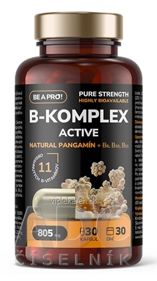 BE A PRO! B – KOMPLEX ACTIVE je vitamínový výživový doplnok, ktorý obsahuje patentovaný komplex vitamínov skupiny B – Lalmin®. Získaný je fermentáciou kvasiniek pomocou špeciálneho výrobného procesu – „biofortifikácie“. Súbor vitamínov je doplnený o cholín, inozitol a kyselinu para-aminobenzoovú (PABA). Vitamíny skupiny B sú potrebné pri mnohých životne dôležitých procesoch, prispievajú k správnemu fungovaniu srdca, imunitného, nervového systému a psychiky, k metabolizmu *(B1, B2, B3, B5, B6, B12 a biotín), ku zníženiu únavy a vyčerpania *(B2, B3, B5, B6), k udržaniu zdravých červených krviniek, k udržaniu dobrého zraku, zachovaniu zdravých slizníc, pokožky, k správnej látkovej premene železa a k ochrane buniek pred oxidačným stresom *(B2, B3, biotín). Ďalej prispievajú k správnej syntéze a látkovej premene steroidných hormónov, vitamínu D a niektorých neurotransmiterov a prispievajú k zdravej duševnej výkonnosti, k správnej syntéze cysteínu, k normálnej látkovej premene bielkovín a glykogénu, k správnej tvorbe červených krviniek, k regulácii hormonálnej činnosti, k správnej syntéze aminokyselín a k správnej tvorbe krvi *(B5, B6, B9, B12). Cholín* prispieva k látkovej premene lipidov, k udržaniu normálnej funkcie pečene.