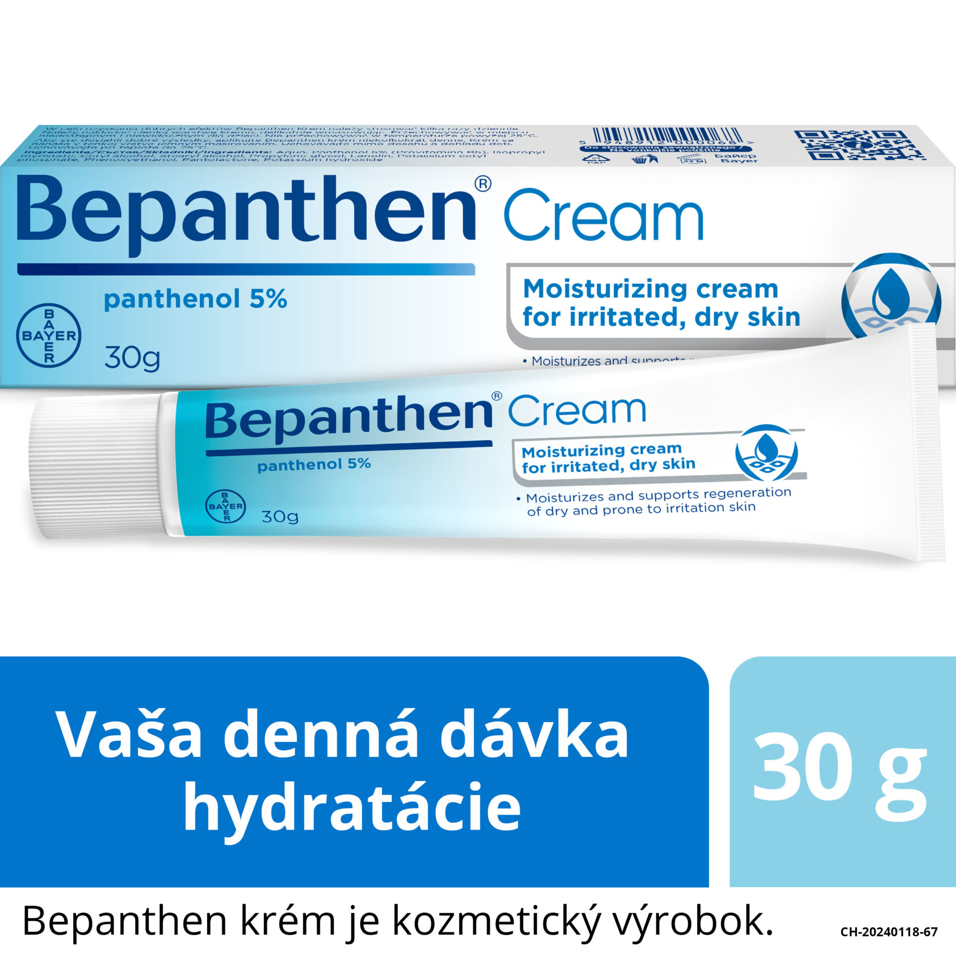 Bepanthen krém je jemný hydrofilný krém na báze emulzie typu „olej vo vode”. Vďaka svojmu špeciálnemu zloženiu s obsahom klinicky overenej hydratačnej látky pantenolu (provitamínu B5) Bepanthen krém rýchlo a intenzívne hydratuje pokožku. Navyše zvhlčuje a zjemňuje aj pokožku náchylnú na podráždenie.