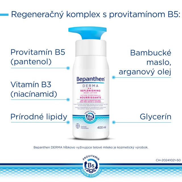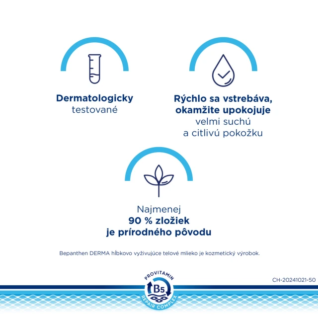 Bepanthen DERMA hĺbkovo vyživujúce telové mlieko poskytuje okamžitú hydratáciu až na 48 hodín. Môžete ho používať každý deň na veľmi suchú a citlivú pokožku. Okamžite upokojuje a pôsobí dlho, pokožku zanecháva hydratovanú, jemnú a hladkú až na 48 hodín. Poskytuje rýchlu úľavu, dlhotrvajúcu starostlivosť a zanecháva pokožku jemnú a hladkú na dotyk. Zložky obnovujúceho komplexu s provitamínom B5 vo výrobku Bepanthen DERMA pôsobia hĺbkovo hydratačne zvnútra na rôznych miestach pokožky.