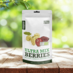 BIO Ultra Mix Berries je zmes sušených brusníc, goji a moruše, ktorá obsahuje ako vitamíny, tak aj minerálne látky a ďalšie zdraviu prospešné zložky. Použité ovocie pochádza z ekologického poľnohospodárstva a má vysoký obsah vlákniny. Vďaka tomu je mix plodov ideálny ako malý snack na cesty alebo na spestrenie jogurtu či raňajkovej kaše.