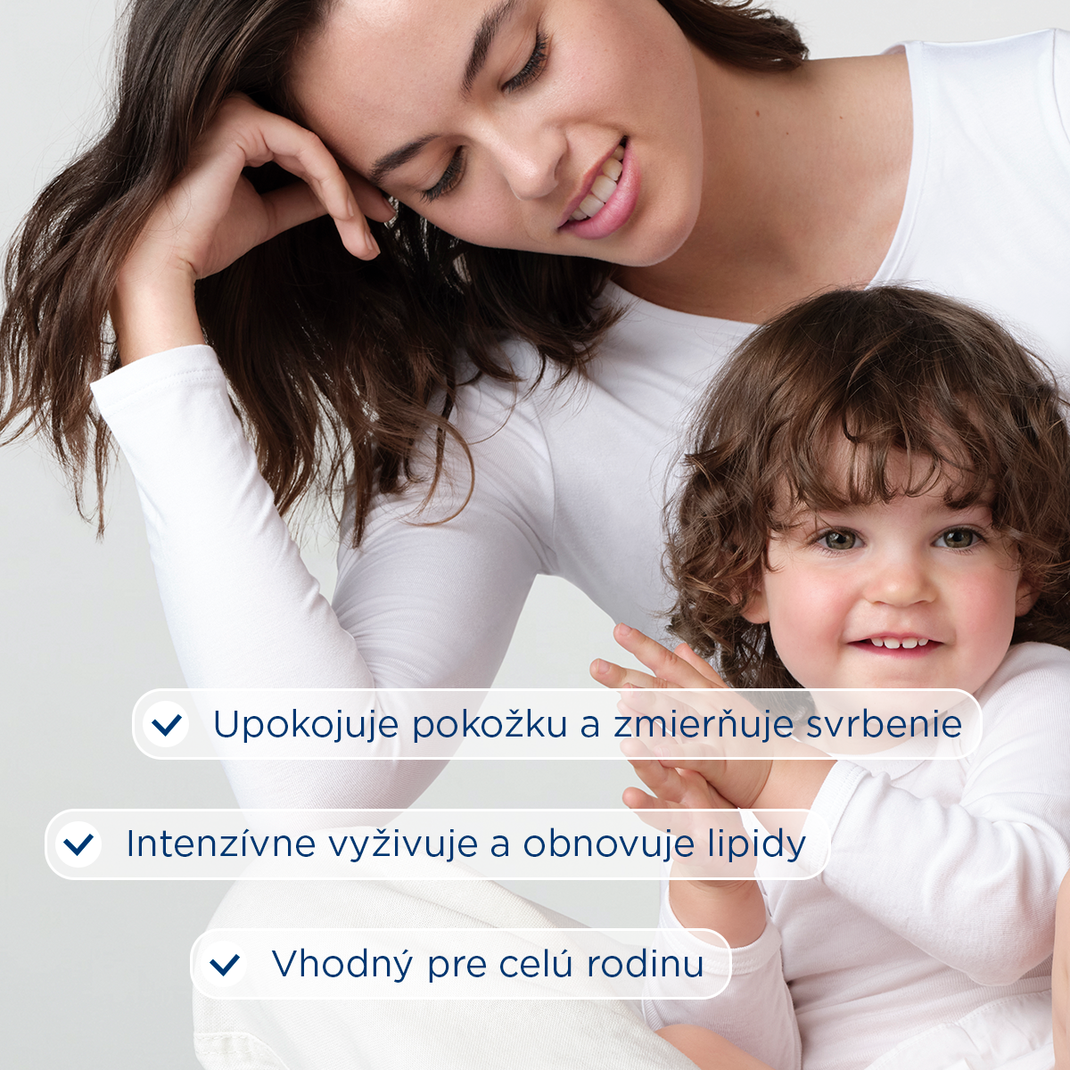 Intenzívna starostlivosť 2v1 pre pokožku s atopickým ekzémom. Starostlivosť proti svrbeniu a regeneračná starostlivosť. Vysoko upokojujúci a vyživujúci krém.