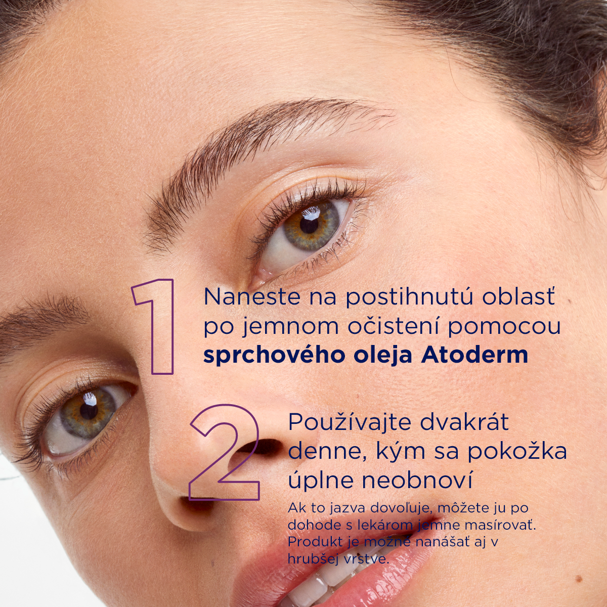 Naneste na poškodené miesto po jemnom očistení sprchovým olejom Atoderm. Používajte dvakrát denne, kým sa pokožka úplne neobnoví. Ak to jazva dovoľuje, po konzultácii s lekárom ju jemne masírujte. Môže sa nanášať v hrubej vrstve.