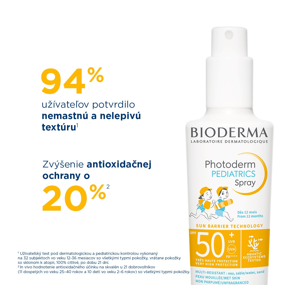 Photoderm PEDIATRICS sprej SPF 50+ je výsledkom odborných znalostí a skúseností spoločnosti Bioderma v oblasti biológie pokožky, ktoré boli použité na riešenie špecifických potrieb detskej pokožky. Veľmi vysoká slnečná ochrana, vysoká odolnosť, nezanecháva viditeľné stopy, hydratácia po dobu 8 hodín.