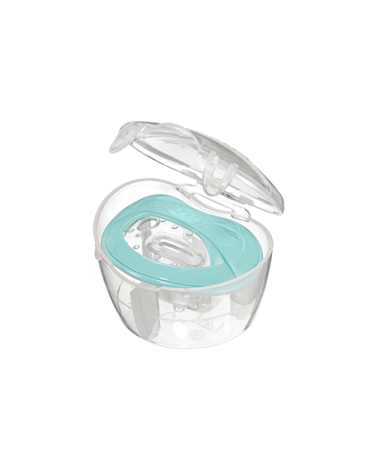Naplňte ho s 25 ml čistej vody, vložte do vnútra cumlík a ohrievajte v mikrovlnnej rúre 3 minúty na výkone 750-1000 W. Pred použitím nechajte vyschnúť. Box používajte iba s cumlíkmi Curaprox a skladujte ho vysušený.