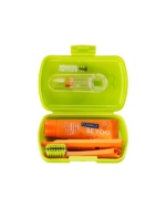 Cestovný set ortho so skladacou kefkou, pastou a medzizubnými kefkami.