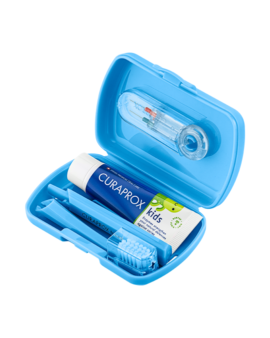 To je nový detský cestovný set Curaprox kids, vďaka ktorému budú mať naši malí zákazníci a zákazníčky všetko potrebné pre zdravý detský úsmev vždy po ruke.