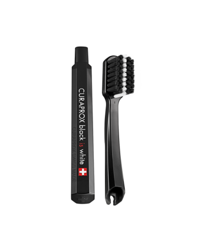 • Skladacia jemná zubná kefka Black Is White s vláknami obsahujúcimi čiastočky uhlíka pre bieliaci efekt