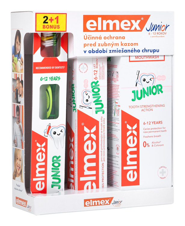 Junior systém proti zubnému kazu v období zmiešaného chrupu od 6 do 12 rokov. Určený na každodenné používanie. Set obsahuje zubná kefka 1 ks + zubná pasta 75 ml + ústna voda 400 ml.