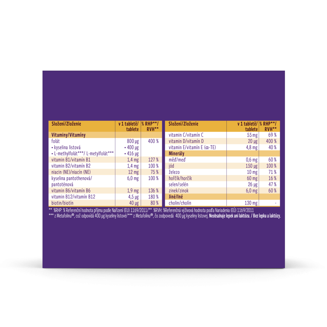 - VYBRANÉ VÝŽIVOVÉ LÁTKY: Obsahuje 800 μg kyseliny listovej, Kyselinu listovú Plus2 (kyselina listová a L-metylfolát), železo, vitamíny skupiny B, vitamíny D a E, biotín, niacín, kyselinu pantoténovú a selén.