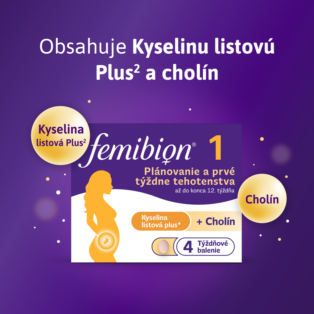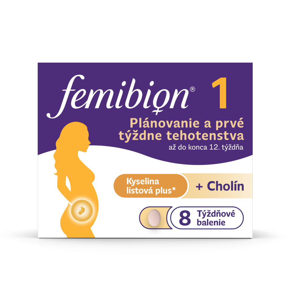 Počas tehotenstva sú rôzne živiny vrátane kyseliny listovej nevyhnutné pre zdravý vývoj Vášho dieťaťa.¹ Každá fáza Femibionu®, od plánovania a prvých týždňov tehotenstva až po dojčenie, je prispôsobená špecifickým potrebám dieťaťa v roznych vývojových fázach každého štádia a dodáva plodu alebo dieťaťu potrebné živiny. Femibion® 1 bol špeciálne vyvinutý na podporu Vášho zdravia pri plánovaní tehotenstva a zdravia Vášho dieťaťa¹ počas prvých 12 týždňov po počatí. Femibion 1 poskytuje cholín, Kyselinu listovú Plus² (kyselina listová a L-metylfolát), vitamíny a minerály, ktorých potreba sa u tehotných žien zvyšuje, a prispieva tak k normálnemu vývoju plodu.¹ Je tiež obohatený o ďalšie látky na podporu zdravia Vášho tela počas plánovania tehotenstva a po počatí¹ vrátane železa, horčíka a vitamínu D.