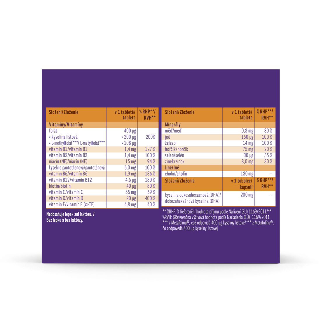 - VYBRANÉ VÝŽIVOVÉ LÁTKY: Tableta obsahuje 400 μg kyseliny listovej a L-metylfolátu, cholín, jód, vitamíny B, vitamín D, vitamín E, zinok, biotín, niacín, kyselinu pantoténovú a selén.