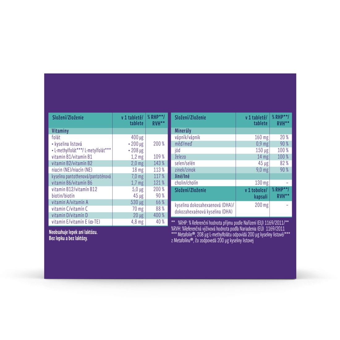 - VYBRANÉ VÝŽIVOVÉ LÁTKY: Tableta obsahuje 400 μg kyseliny listovej a L-metylfolátu, cholín, jód, vitamíny B, vitamín D, vitamín E, zinok, biotín, niacín, kyselinu pantoténovú, železo, vápnik a selén.