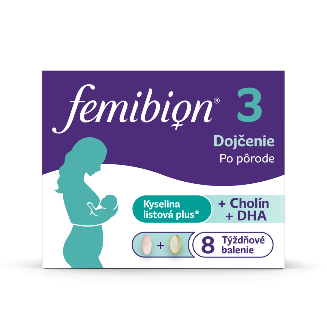 Každá fáza Femibionu má špecificky vybrané výživné látky pre plánovanie bábätka, tehotenstvo a dojčenie. Femibion 3 je špecificky vyvinutý tak, aby podporoval Vás¹ a Vaše dieťa² po narodení. Po narodení a počas dojčenia Vaše dieťa začína štádium významného vývoja. Okrem Kyseliny listovej Plus³ (kyselina listová a L-metylfolát) a cholínu obsahuje Femibion 3 aj omega-3 mastnú kyselinu DHA na podporu normálneho vývoja mozgu, očí a zraku dojčeného dieťaťa.²