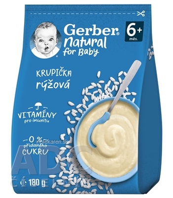 GERBER Natural ryžová krupička je vyrobená zo starostlivo vybranej ryže, ktorá tvorí základ pre ryžovú múku vysokej kvality vhodnú už pre prvú lyžičku. Krupička je vhodná pre dojčatáod ukončeného 4. mesiaca. Neobsahuje pridaný cukor1 ani glutén, preto je vhodným začiatkompre každé malé bruško v období prvých príkrmov. Môže byť použitá aj pri diétnom režime pre staršie deti a dospelých.