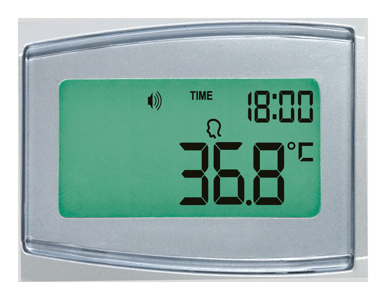 - zvukový alarm horúčky pri teplote nad 37,5 °C,