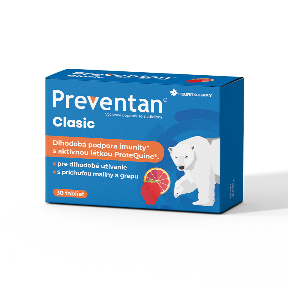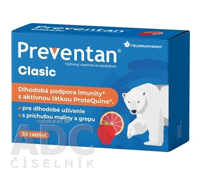 Preventan Clasic so sladidlom v tabletách s príchuťou maliny a grepu. Obsahuje originálnu aktívnu látku ProteQuine® (aminokyseliny, oligopeptidy, nukleotidy) a vitamín C. Určený na dlhodobé užívanie.
