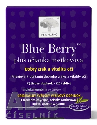 Blue Berry TM je originálny švédsky výživový doplnok prospievajúci k udržaniu dobrého zraku a vitality očí. Tablety obsahujú výťažok z čučoriedky, extrakt z kvetov aksamietnice rozložitej so štandardizovaným obsahom 10 mg luteínu, výťažok z očianky rostkovovej, vitamín A, zinok a meď. Luteín je karotenoid, ktorý sa prirodzene nachádza v očnej makule, ktorá zodpovedá za centrálne videnie. Vitamín A (nazývaný očný vitamín) a zinok zohrávajú dôležitú úlohu pri udržaní dobrého zraku a sú nevyhnutnými živinami pre zachovanie vitality očí.