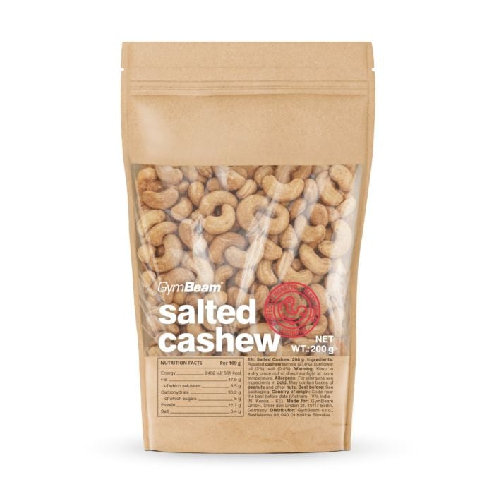 Pražené jadrá kešu orechov (97,6 %), slnečnicový olej (2 %), soľ (0,4 %).