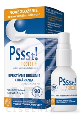 Pssst! FORTE ústny sprej proti chrápaniu obsahuje unikátnu účinnú zložku VOLUME CONTROL COMPLEX TM, ktorá je jedinečnou kombináciou rastlinných extraktov svetlíku lekárskeho, ostropestreca mariánskeho, chmeľu otáčavého, panthenolu, šalviovej a eukalyptovej silice a mentolu.