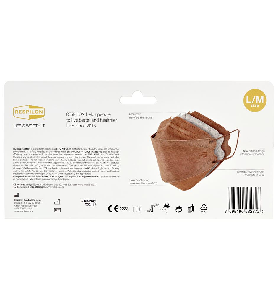 Nanovláknový respirátor VK RespiRaptor je respirátor triedy FFP2 NR chrániaci užívateľa pred vplyvom škodlivých patogénov z okolitého prostredia. Je plne certifikovaný podľa normy EN 149:2001+A1:2009.