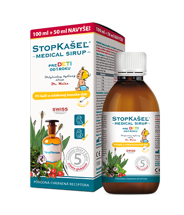 STOPKAŠEĽ Medical sirup PRE DETI OD 1 ROKU bol vyvinutý špeciálne pre potreby detského organizmu, môžu ho užívať deti od 1 roku. Je vhodný pre alergikov, celiatikov a diabetikov (sladený fruktózou a sukralózou), môžu ho užívať tehotné a dojčiace ženy (obsahuje výber šetrných a bezpečných bylín).
