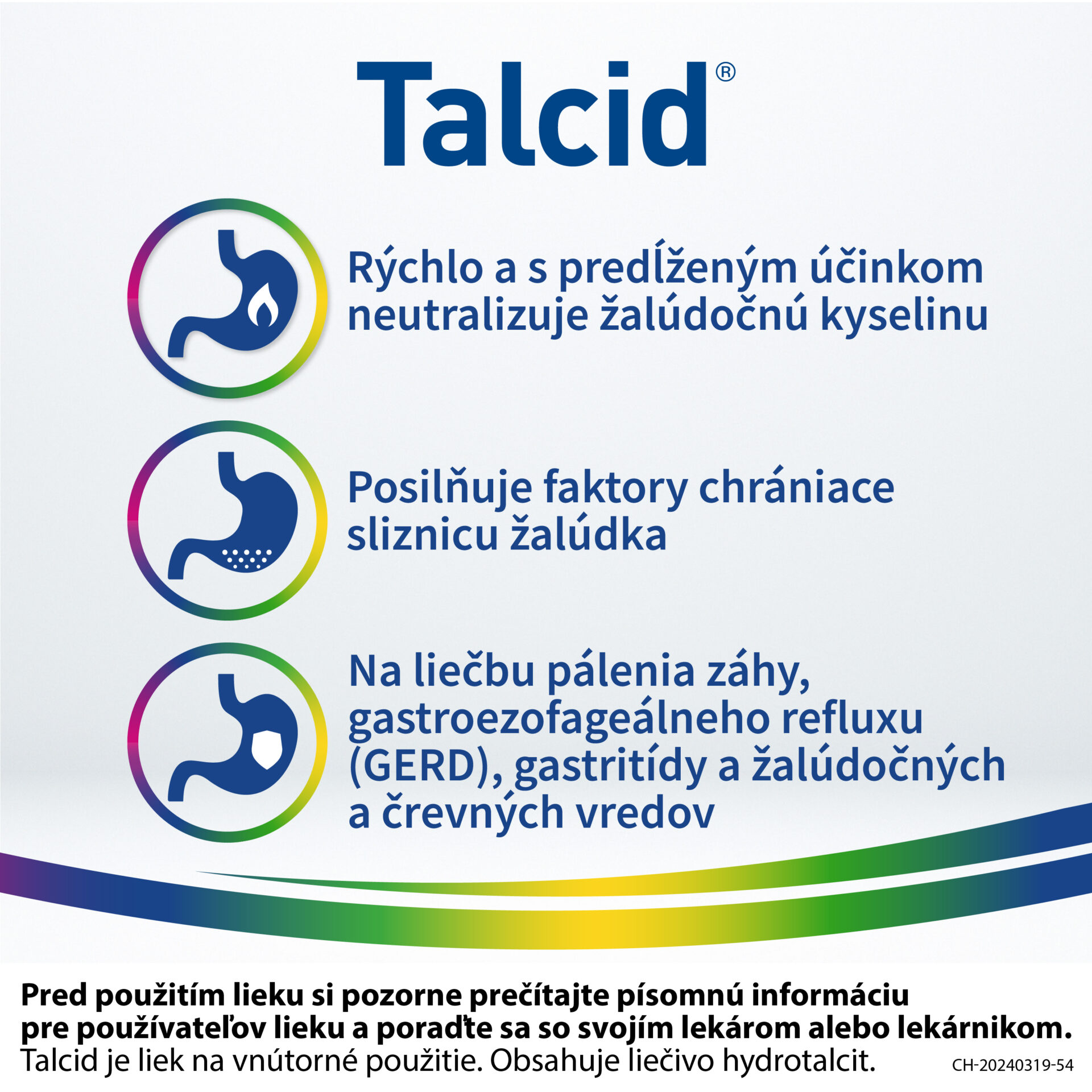 Pred použitím lieku si pozorne prečítajte písomnú informáciu pre používateľov lieku a poraďte sa so svojím lekárom alebo lekárnikom. Talcid je liek na vnútorné použitie. Obsahuje liečivo hydrotalcit.