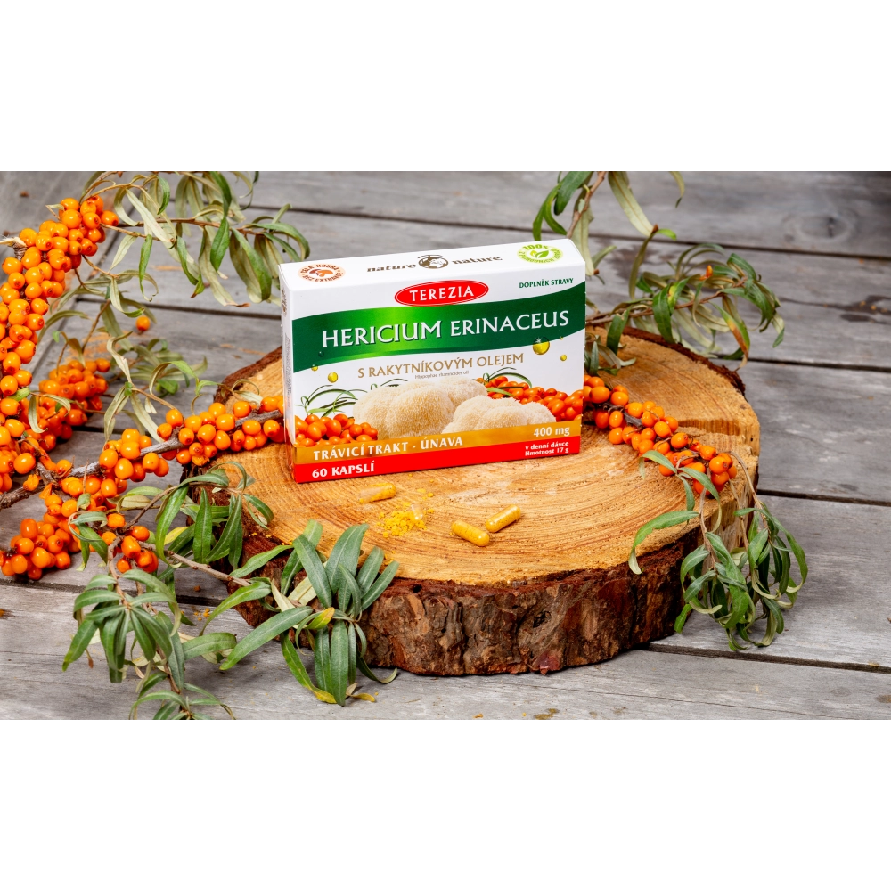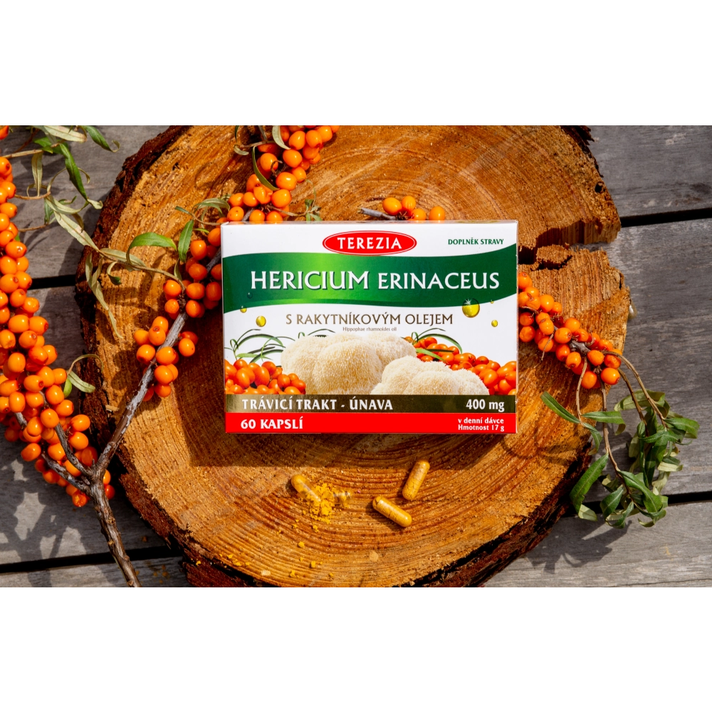 HERICIUM ERINACEUS s rakytníkovým olejom je hubovo-rastlinný produkt, ktorý je určený na podporu vášho trávenia. Koralovec ježovitý (Hericium erinaceus) je výborná jedlá huba, ktorá zároveň patrí k významným prospešným hubám a je využívaná najmä v Ázii. V Českej republike sa vyskytuje veľmi vzácne. Obsiahnutý rakytník rešetliakovitý vo forme 100% čistého rakytníkového oleja podporuje činnosť zažívacieho traktu. HERICUM ERINACEUS s rakytníkovým olejom je 100% prírodný produkt bez chemických prímesí a konzervantov.