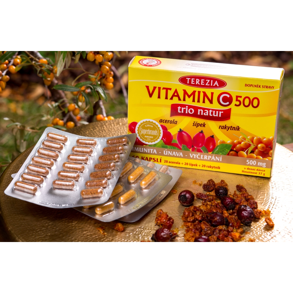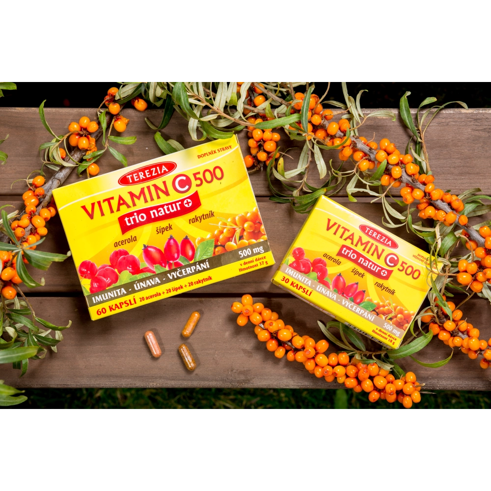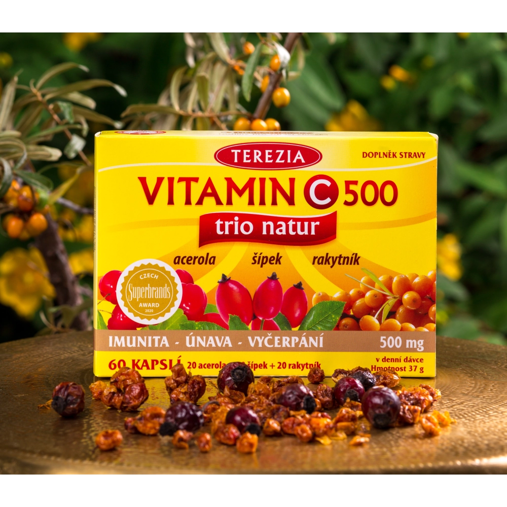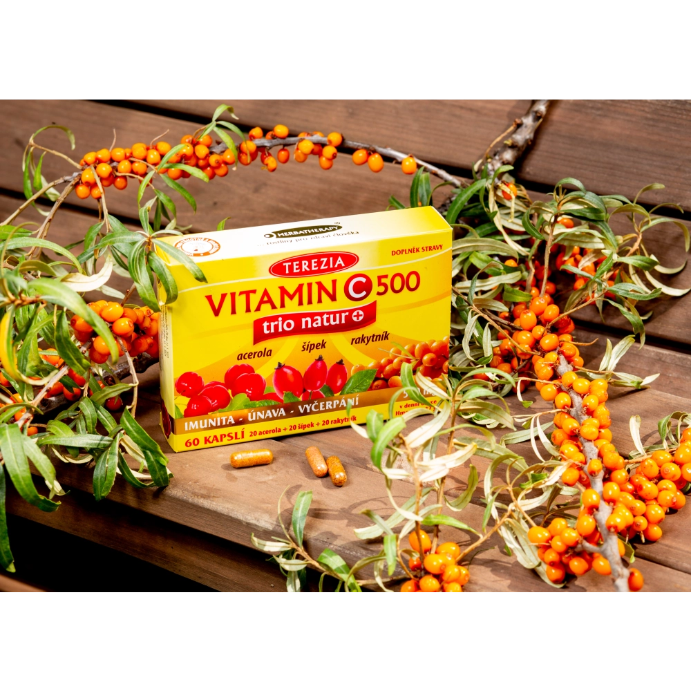 Vitamín C z bohatých prírodných zdrojov ako sú šípky, acerola a rakytník. Balenie obsahuje 20 kapsúl z každého druhu – šípka. acerola, rakytník. Vďaka tomu je ľudským organizmom lepšie vstrebávaný. Vitamínom C nie je možné sa predzásobiť, preto je potrebné ho dopĺňať každý deň. Vitamín C podporuje obranyschopnosť organizmu, nervový systém a prispieva k zníženiu únavy a vyčerpania.